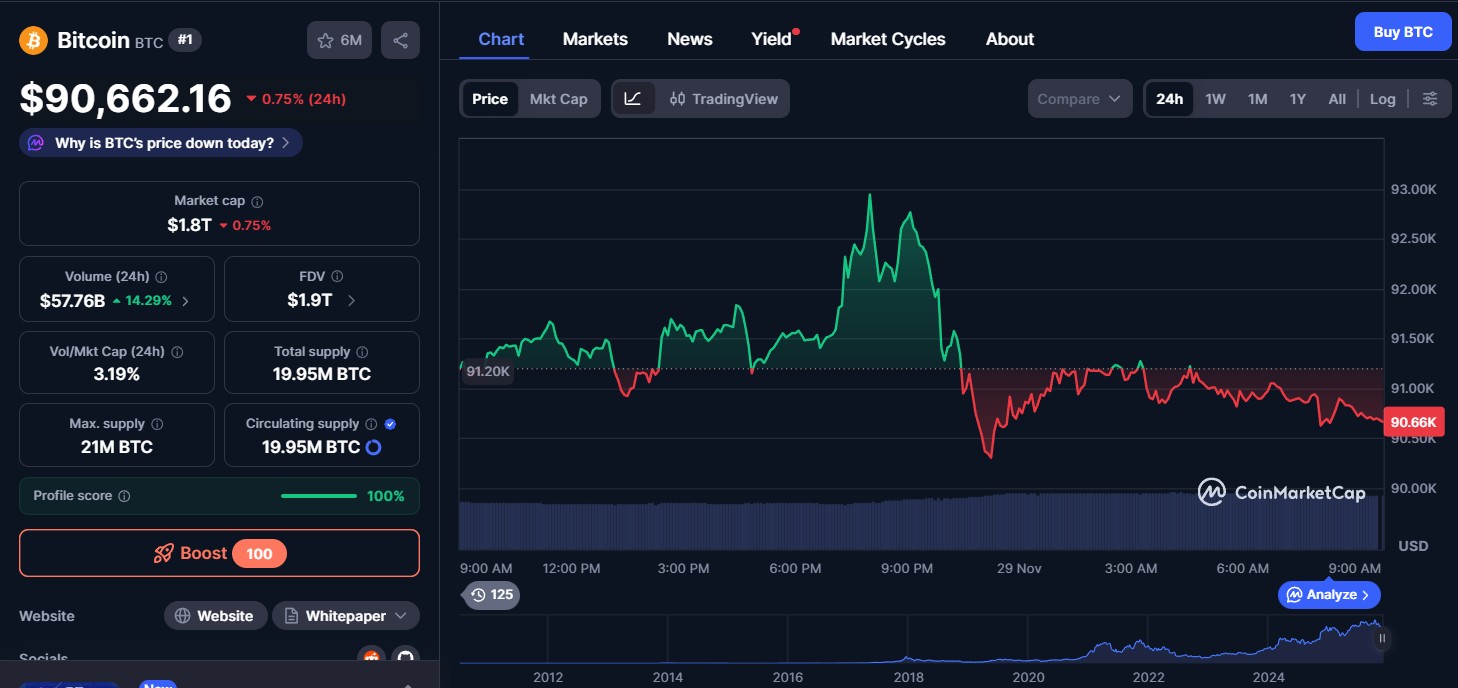 比特币目前的价格为 90662 美元。这相当于过去24小时内下跌了0.73%。交易量为575.3亿美元,市值为1.81万亿美元。