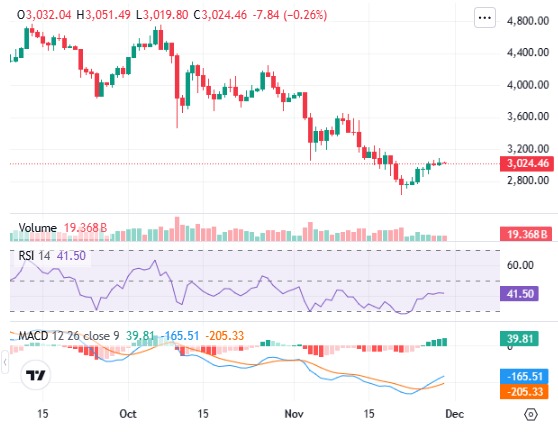 以太坊价格报 3,023 美元,过去 24 小时上涨 0.65%,本周累计上涨约 10%。价格从 2,626 美元的 200 周移动均线反弹,显示出强劲的长期支撑。