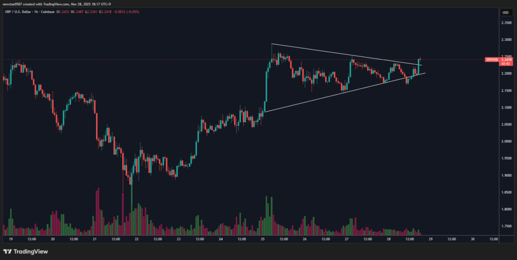 XRP图表显示,在从2.00区域大幅突破上涨后,形成了一个相当清晰的对称三角形。价格一直在上升的支撑线和下降的阻力线之间盘旋,随着成交量逐渐减弱,盘整也愈发紧缩,这是波动性扩张前的典型行为。