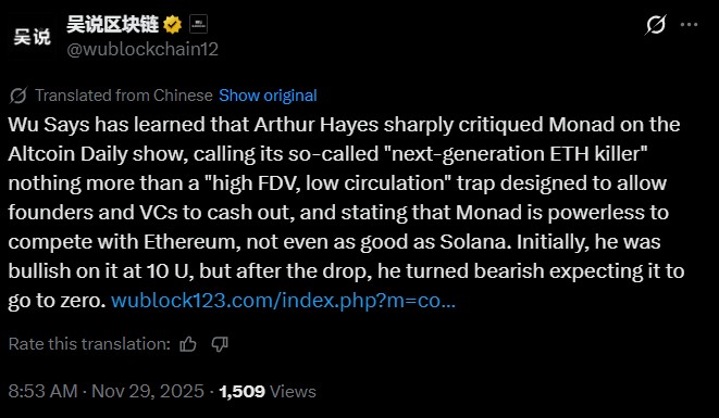 Arthur Hayes 声称 Monad 的技术和代币经济模型存在根本性缺陷,并警告称,如果没有真正的采用和更强有力的执行,该代币可能难以维持价值,这在加密生态系统中引发了辩论。