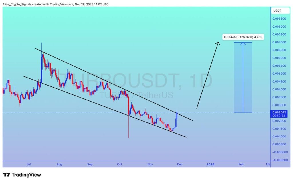 涡轮图表显示,价格突破了自仲夏以来一直控制价格的清晰下降通道。经过数月不断走低后,最新一轮上涨推动K线直接突破了通道的上轨趋势线,这通常是空头动能减弱的第一个信号。