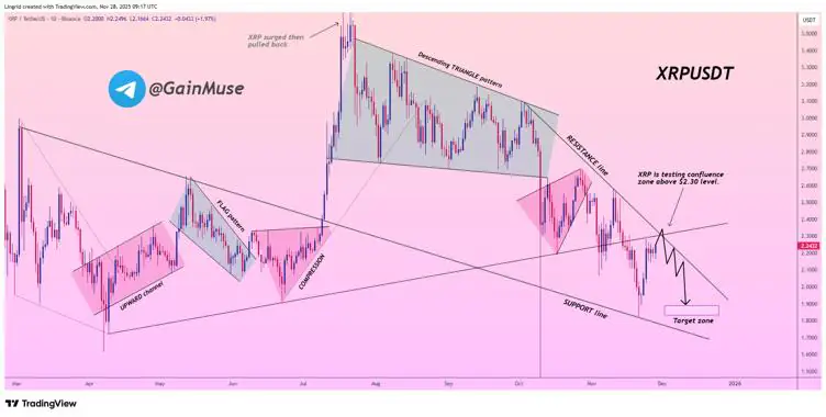 XRP 的价格预测目前如同棋局一般,面临着阻力。XRP 目前在 2.50 美元下方交易,该价位在 11 月份曾三次阻碍价格上涨。短期图表显示出典型的盘整形态。成交量低于 10 月份的水平,但在 2.08 美元的支撑位附近出现了成交量激增。