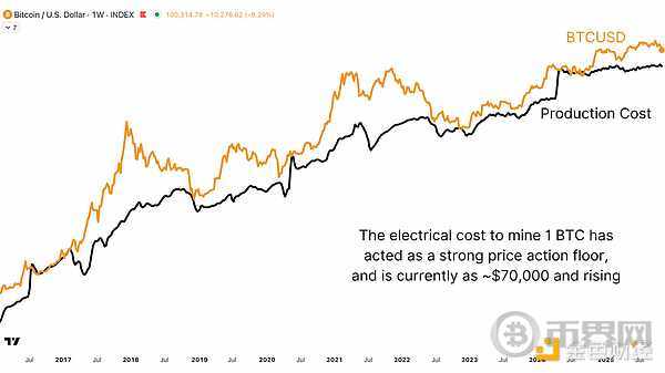 图5:生产1个比特币的估计电力成本约为7万美元,这构成了一个强有力的价格波动下限。