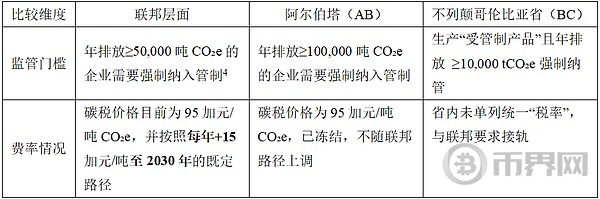 表:联邦层面、阿尔伯塔(AB)与不列颠哥伦比亚省(BC)碳税费率收费比较