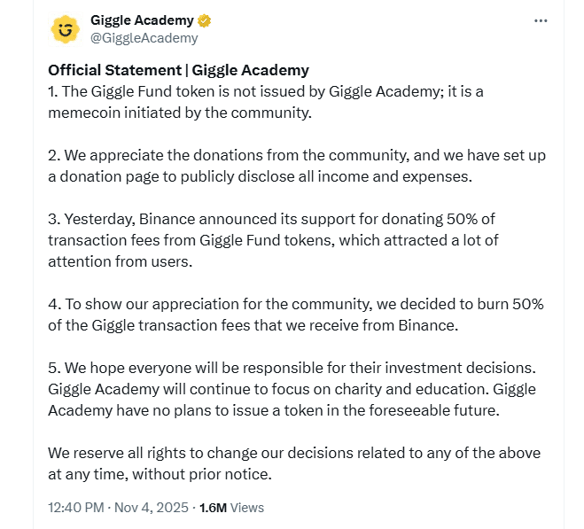 另一方面,币安建议的将其交易手续费以 Giggle Fund 代币的形式捐赠出去。