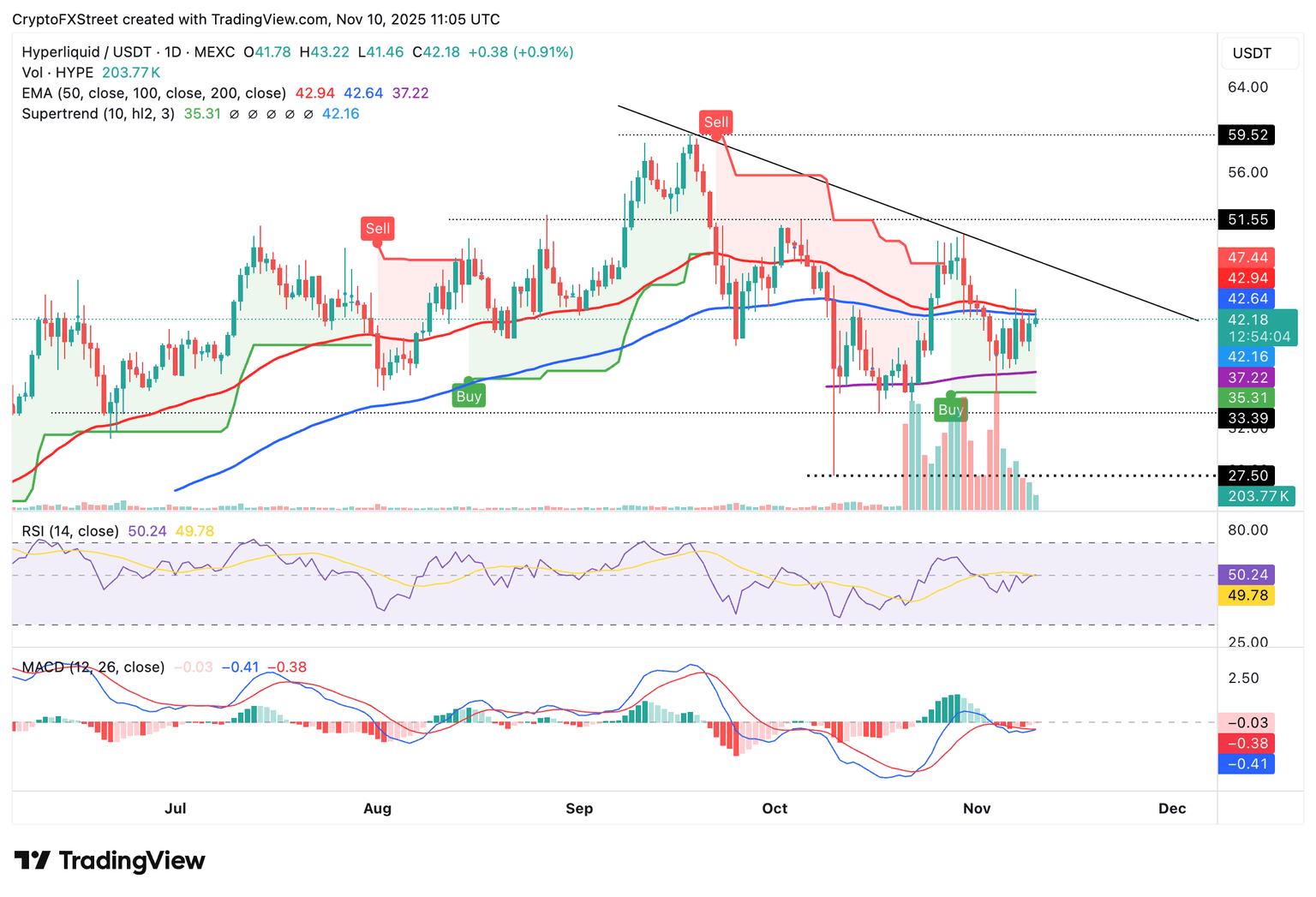 SuperTrend 指标已跌破 Hyperliquid 的价格,预示着市场可能由看跌转为看涨。然而,如果 HYPE 未能突破 42.64 美元的汇合阻力位,则可能出现回调。如果跌破关键的 40.00 美元关口,200 日均线 37.22 美元将成为下一个主要支撑位。