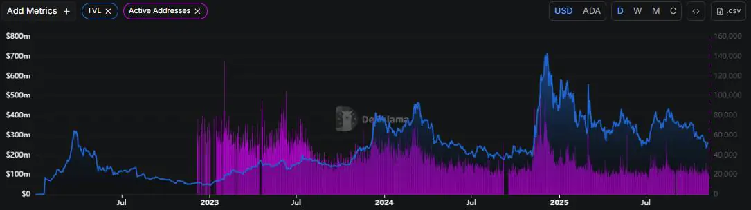 例如,总锁定价值(TVL)已从2024年底的7亿美元以上降至目前的2.6252亿美元。活跃地址数也呈现类似的走势,在2024年底达到峰值,目前尚无复苏迹象。