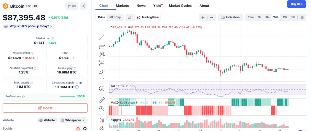 根据CoinMarketCap数据,比特币自2025年10月的历史高点(约126,198美元)已下跌超30%,当前交易价格在87,390美元附近,市值约1.7万亿美元。