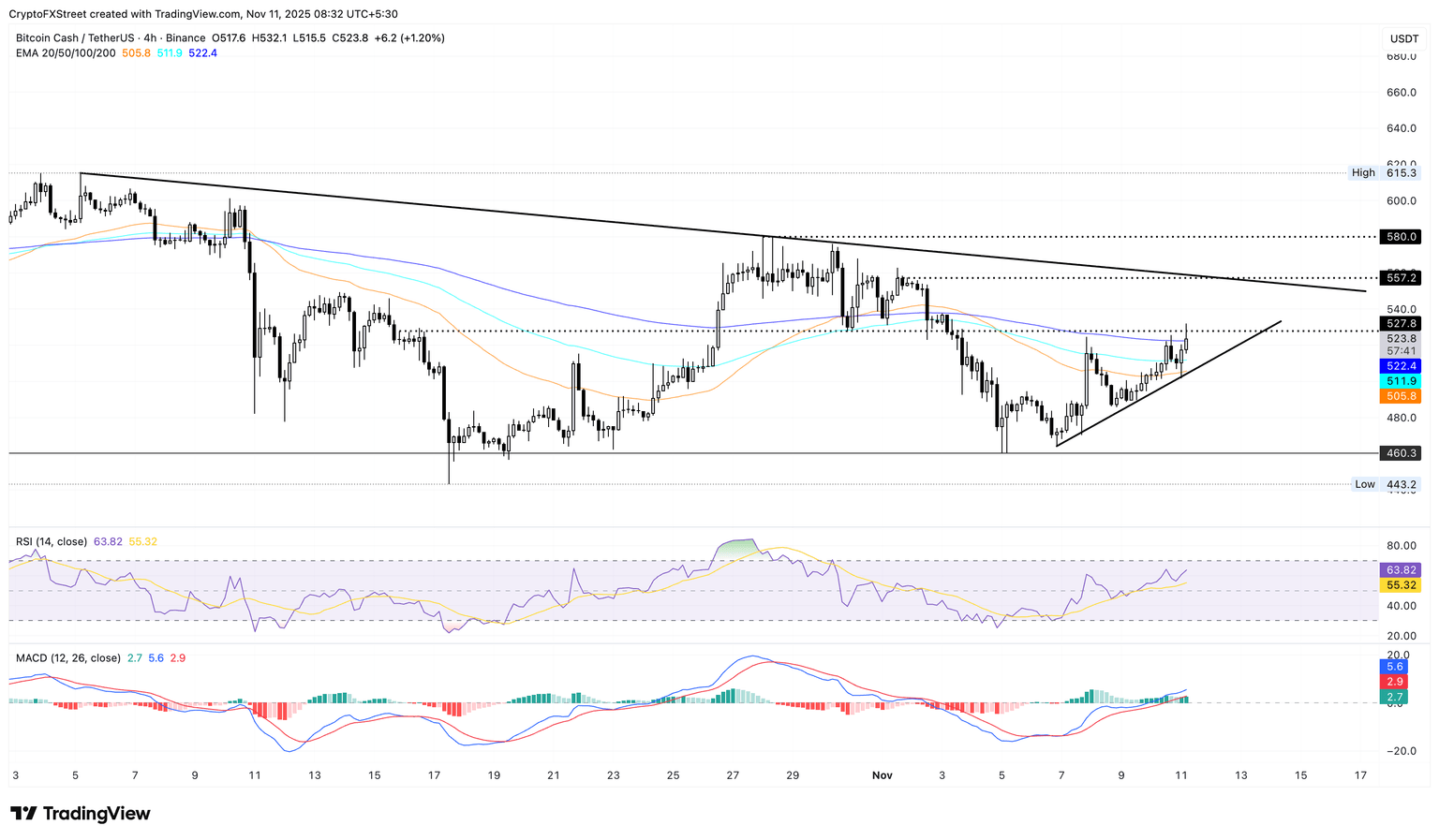 比特币现金 (BCH) 在 4 小时图上的反弹行情形成了一条局部支撑趋势线。BCH 价格突破 500 美元心理关口,继续上涨,并逼近 10 月 15 日高点所对应的 527 美元阻力位。