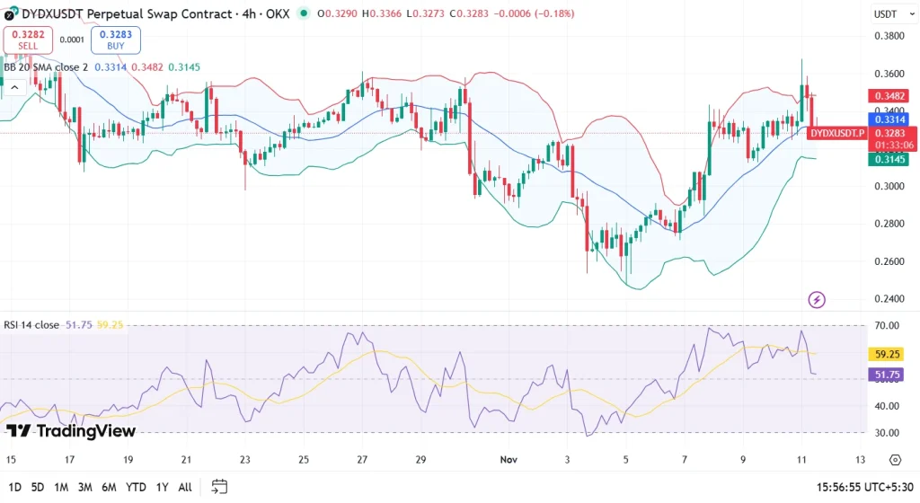 DYDX 交易价格接近 0.3283 美元,在 20 周期均线 0.3314 美元上方盘整。技术指标显示: