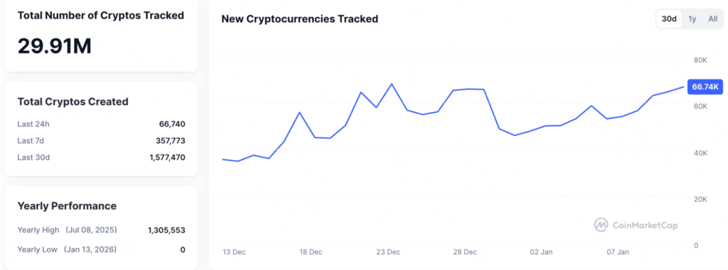 这意味着,在2026年的头12天里,市场就新增了约62万种新的加密货币资产。