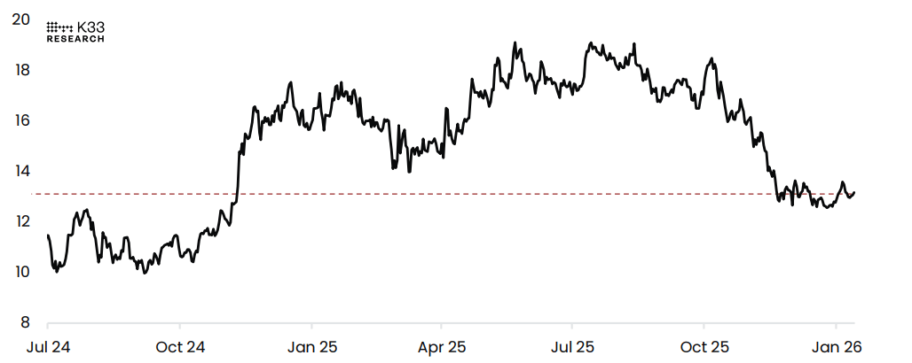 BTC/SPX 比率图表。来源:K33 Research