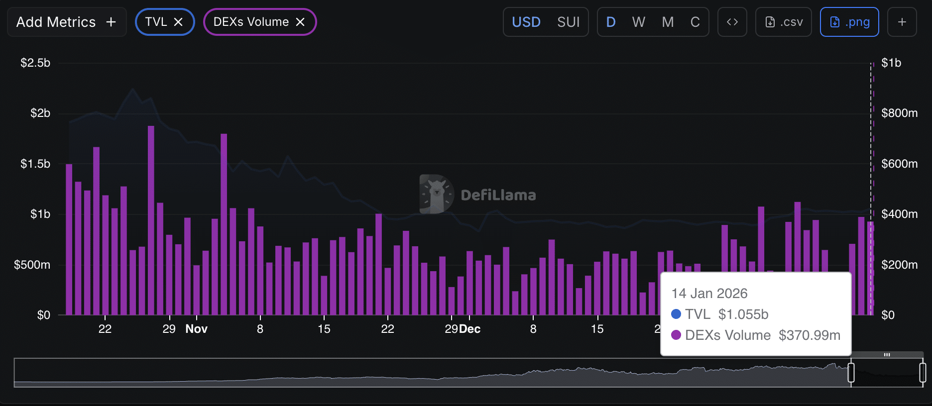 截至1月14日,其TVL约为10.5亿美元,为数周以来的最高水平,较去年12月底约9亿美元的水平有所反弹。同日,其去中心化交易所(DEX)的日交易量也达到了约3.71亿美元。