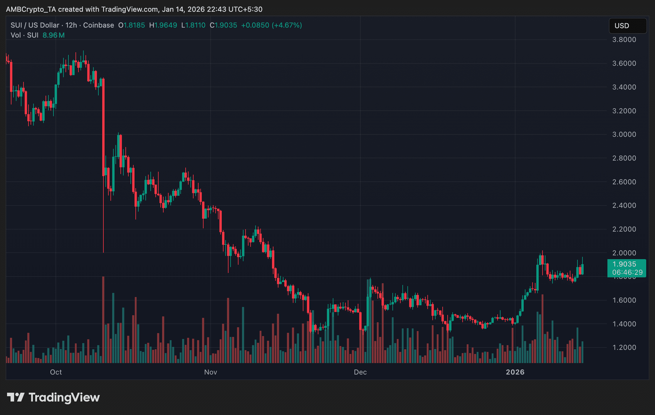 网络中断前,SUI代币价格显示出上涨势头。在12小时图表上,其价格约为1.90美元,当日上涨约4.7%,已从12月1.40美元附近的低点反弹。