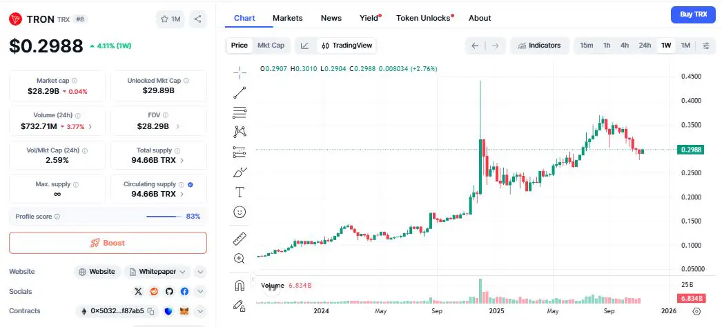 Tron的交易价格约为11月13日,价格为0.29美元至0.30美元与一个市值
