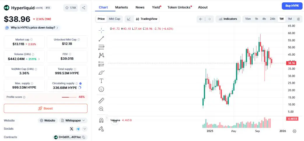 HYPE 股价在 2025 年 9 月创下 59.37 美元的历史新高,随后在 10 月份的回调中回落至 32 美元左右。目前股价在 38 美元至 40 美元区间震荡,这意味着现在买入的价格比历史最高价低了大约 30%。