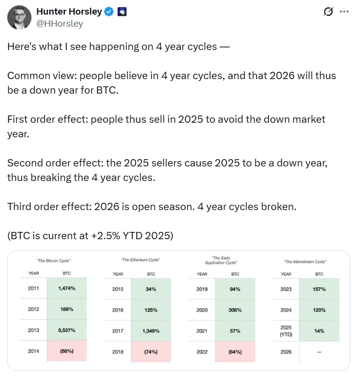 X论坛上的其他加密货币高管也对市场回调的原因提出了自己的看法。Bitwise Asset Management首席执行官Hunter Horsley认为,四年周期理论可能是导致市场回调的罪魁祸首,因为交易员们对每隔几年就会出现一次下跌的预期感到恐慌,最终通过抛售加剧了下跌。