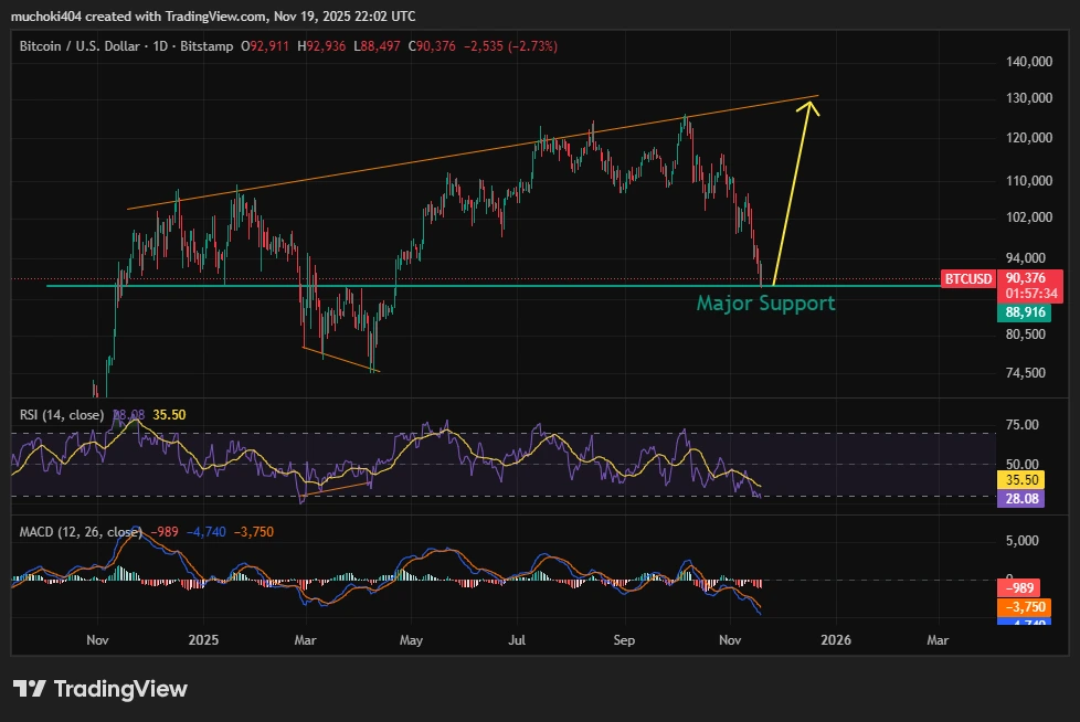 2025年11月19日星期三,比特币(BTC)价格领跌整个加密货币市场,市场情绪悲观。这种旗舰代币下跌超过3%,触及约88.5万美元的区间低点,随后反弹,截至发稿时交易价格约为90.5万美元。