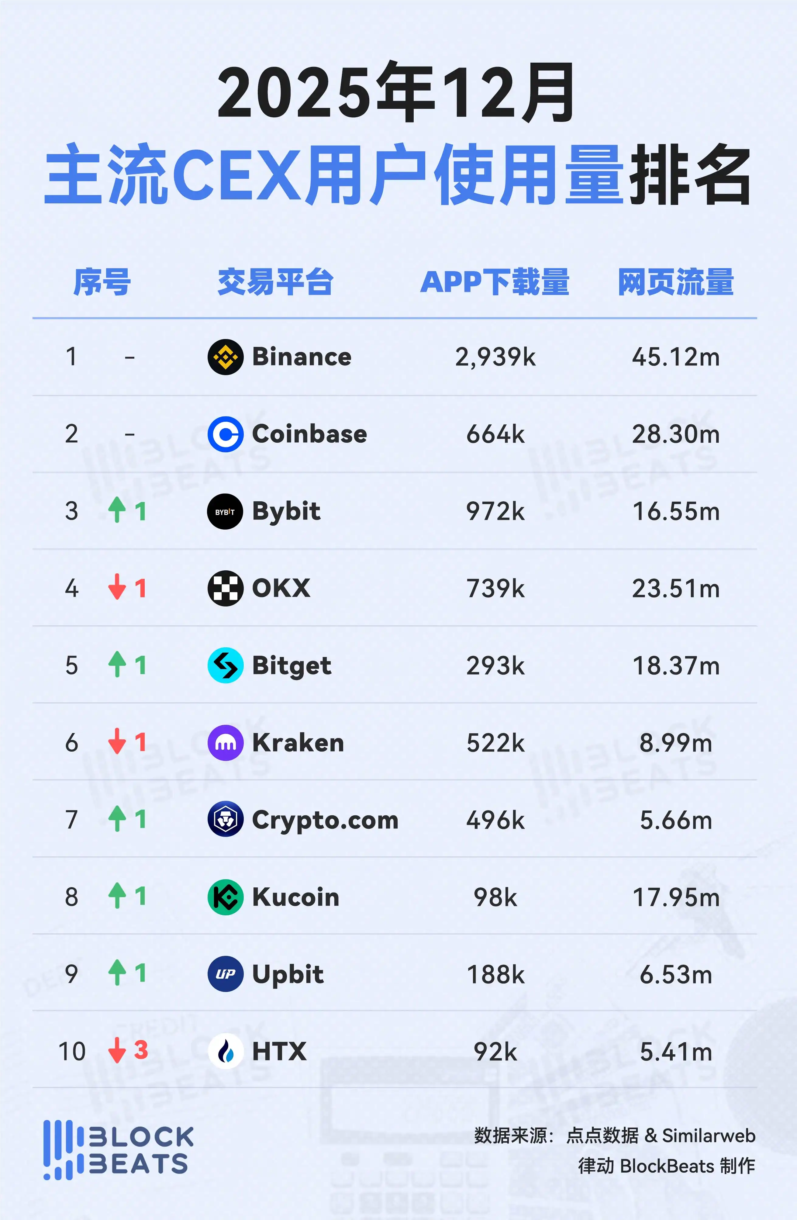 - 网站浏览量: 整体下降11%。OKX (+11.37%)、Bitget (+7.43%) 和 Bybit (+5.68%) 实现了逆势增长;而Coinbase (-13.64%)、Upbit (-20.46%) 和 HTX (-75.29%) 则出现下滑。