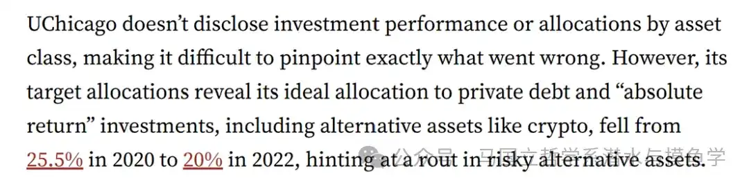 值得注意的是,2022财年该校捐赠基金总投资亏损高达约15亿美元。尽管无法断定其中多少源自加密货币,但其资产配置策略的变化暗示了对高风险资产的收缩。目标配置显示,对“绝对回报”(包含加密货币等另类资产)的配置比例从2020年的25.5%降至2022年的20%。