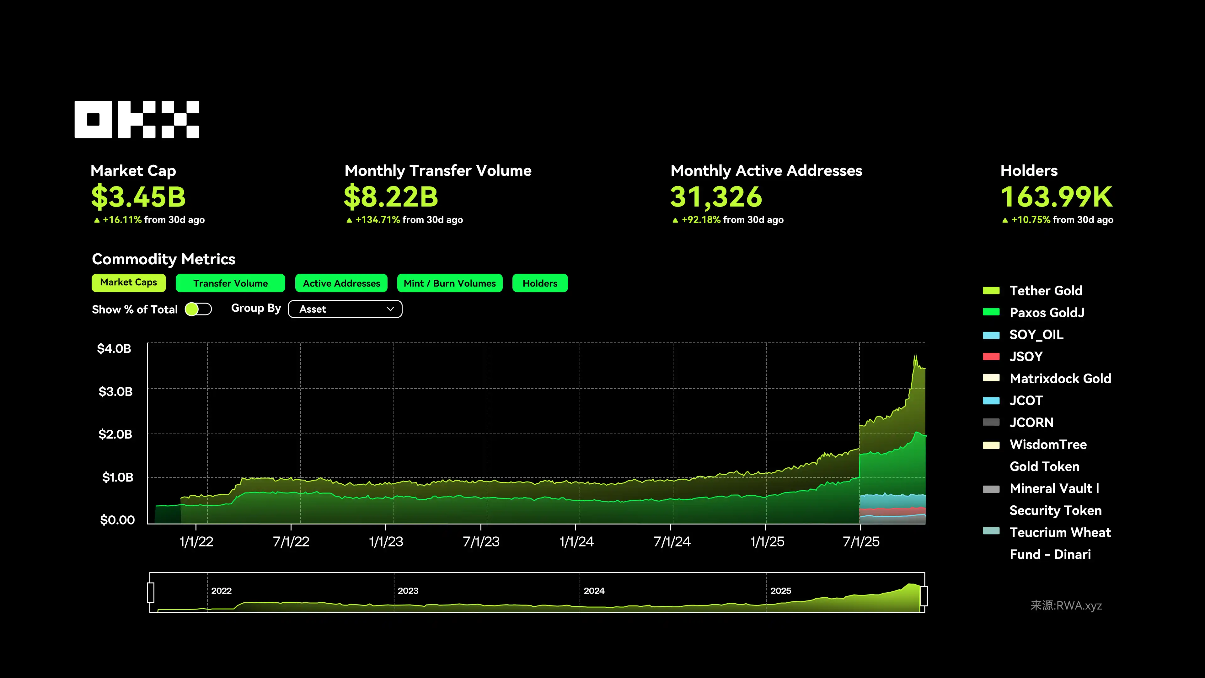 截至 11 月 10 日,当前 RWA 领域的大宗商品类代币呈现出显著的增长态势,总规模从早期不到 10 美元逐步增长至约 35 亿美金、月交易量达 82.2 亿美金、月活跃地址数为 31,326 个、持有者数量为 16.4 万。尤其是黄金类代币表现突出,石油和大豆等大宗商品代币化资产,近期呈现加速上涨趋势,整体市场活跃度和规模都在快速扩张。