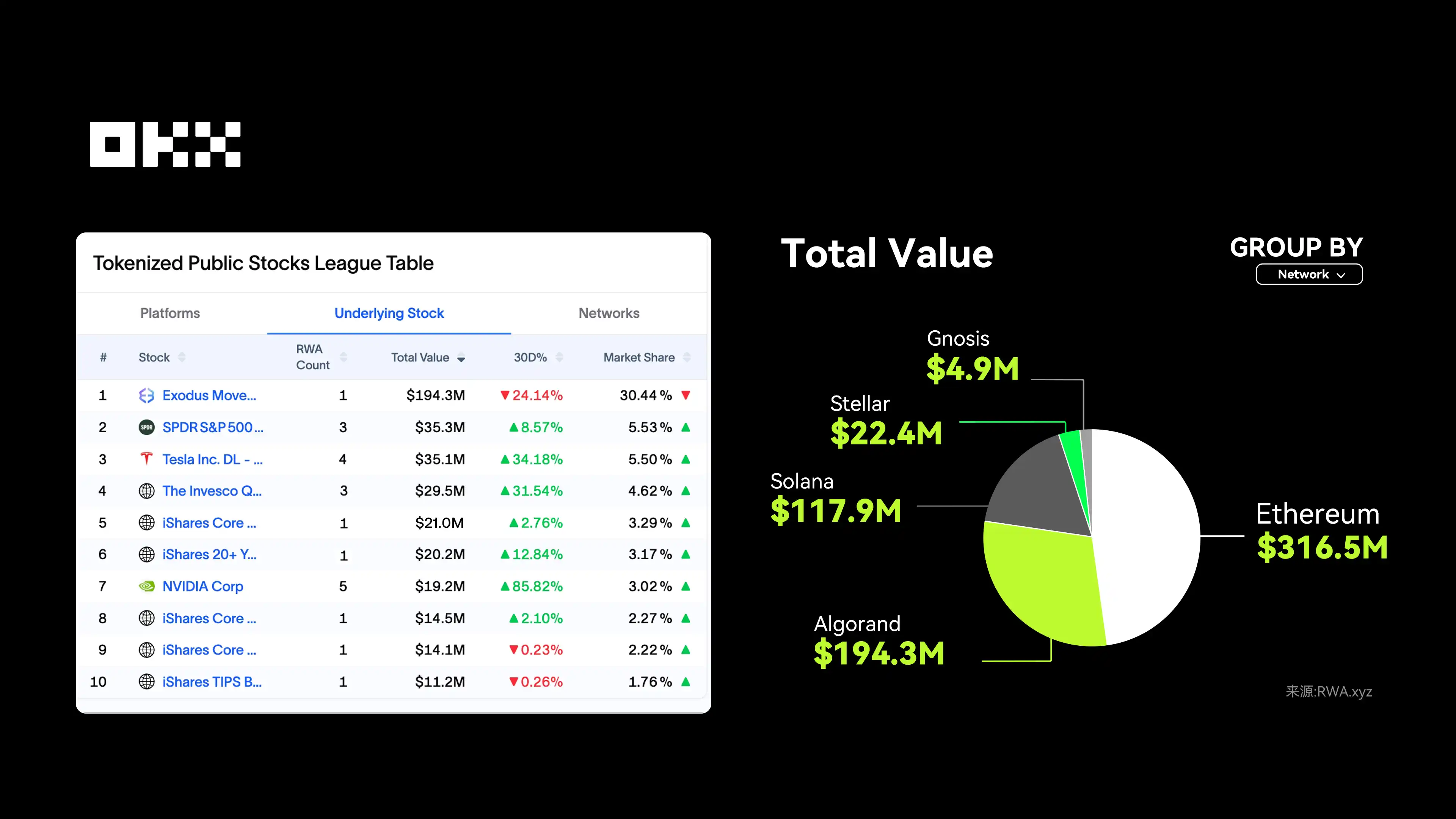 截至 2025 年 11 月 10 日,上市股票总锁仓价值为约为 6.61 亿美元、月交易额达 9.73 亿美元(环比 +56.35%),活跃地址 75,738(环比 +133.38%),持有者总数突破 10.9 万(环比 +34.43%),总体看用户参与度与交易热度正在持续回升,市场正在迎来一轮新的增长周期。