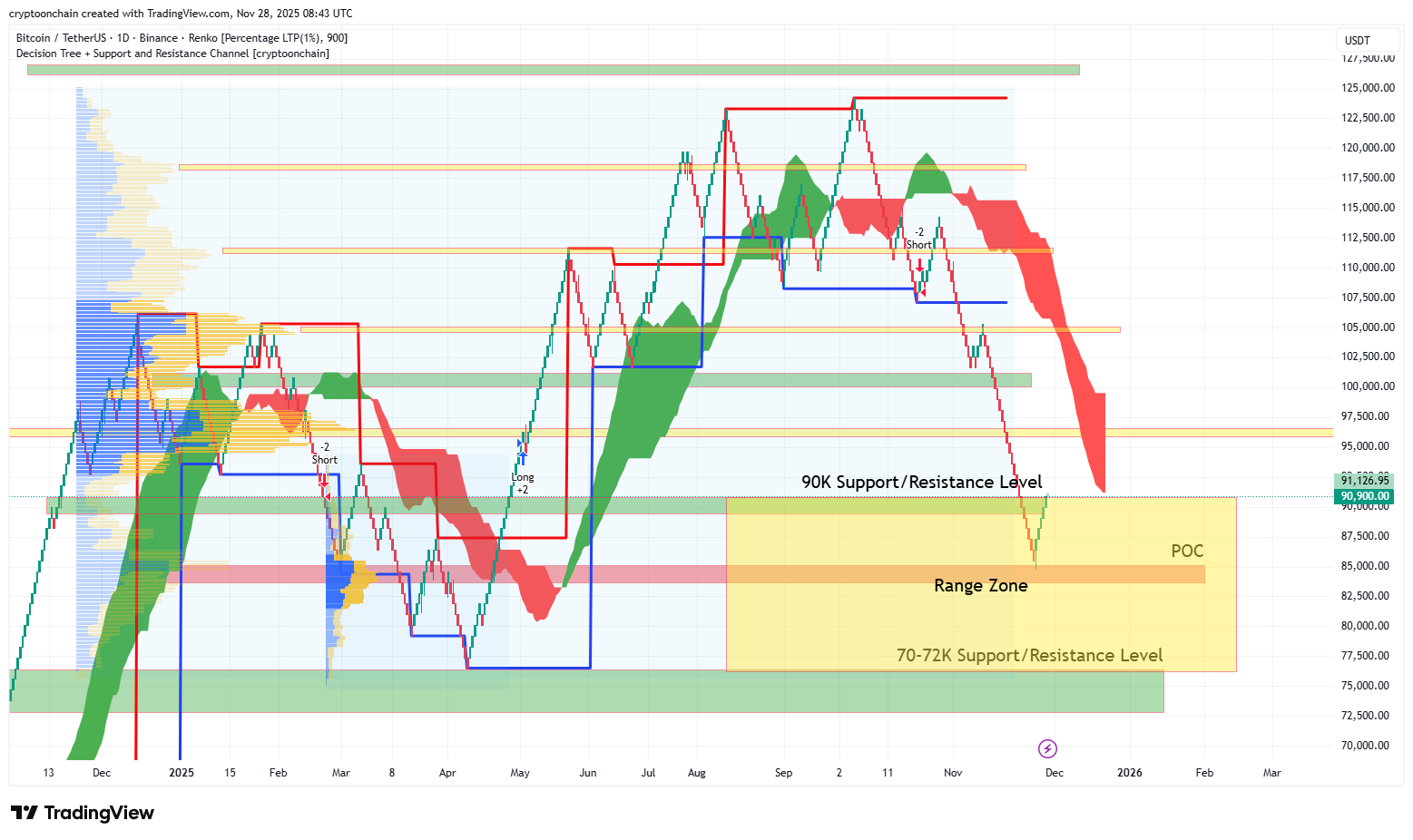CryptoOnchain 表示,比特币价格在概念验证 (POC) 阶段于 82,000 美元附近反弹后,目前已稳定在 70,000 美元至 90,000 美元之间的“清晰”盘整区间。尽管比特币价格目前高于 90,000 美元,但该分析师指出,这一市场领导者仍面临潜在的回调。