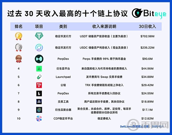 据 DefiLlama 截至 2025 年 11 月 27 日的数据,过去 30 天收入最高的十个链上协议如图所示。