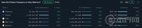 过去一年,如果只看公链的总交易费用收入,可以更清楚看到哪些链真正转化出了使用价值。以太坊全年收入为 7.39 亿美元,仍然是最主要的收入来源,但受到 Dencun 升级和 L2 分流影响,同比下降 71%。相比之下,Solana 年收入达 7.19 亿美元,同比上涨 26%,在 Meme、AI Agent热潮的带动下实现用户活跃度和交互频次的显著提升。Tron 收入为 6.28 亿美元,同比增长 18%。而比特币全年收入为 2.07 亿美元,主要受铭文交易热度下滑影响,整体跌幅明显。