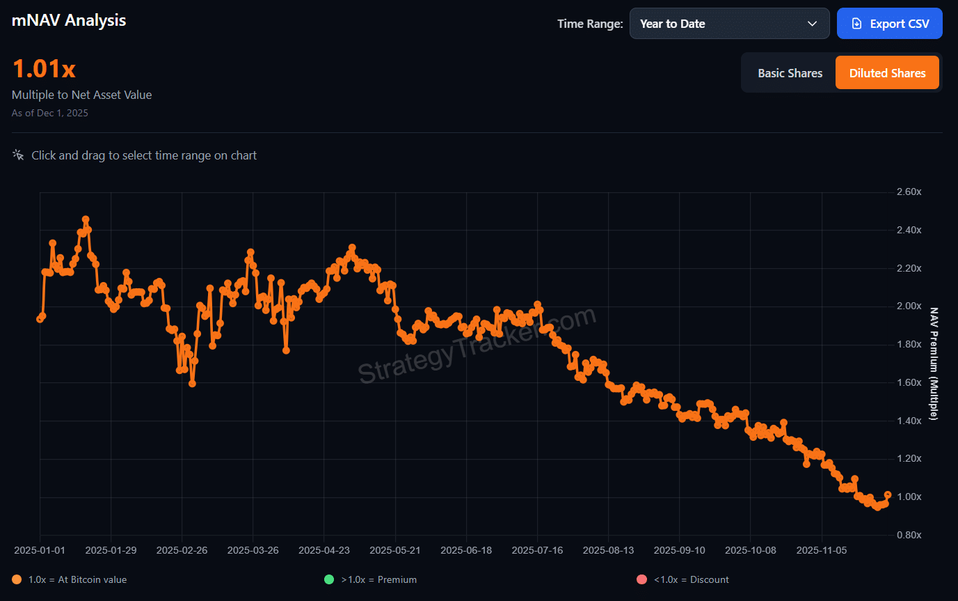 但深入分析数据后,就不难理解该股为何承压。其市值与净资产值之比(mNAV)约为1.01倍,这意味着市场对该公司的估值大致与其比特币持有量相当。