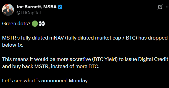 截至发稿时,mNAV 已跌破 1,一些人,例如 Starknet 首席执行官 Eli Ben-Sasson,警告该策略会抛售其持有的比特币。