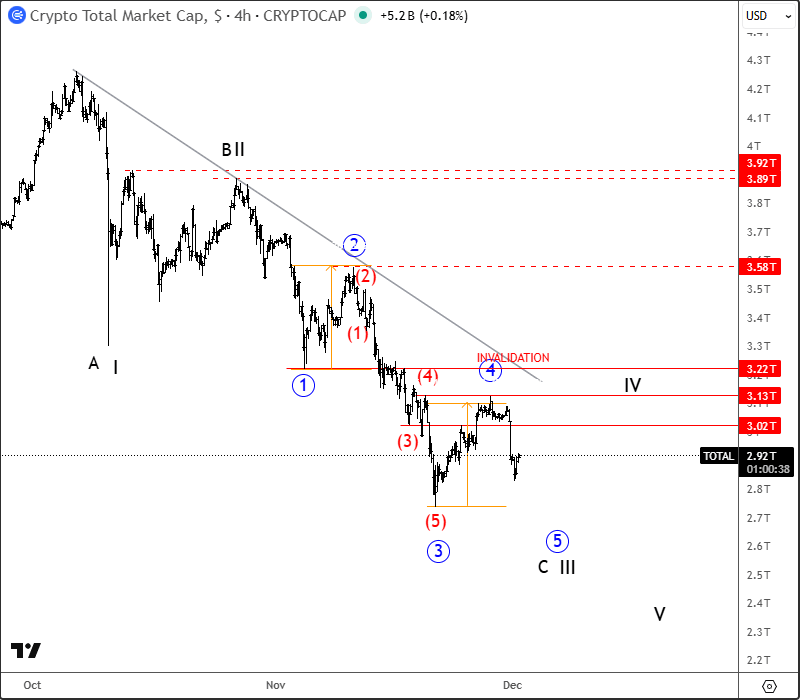 加密货币市场仍面临下行压力,仍有下跌空间。我们看到日内出现了一些反弹,但只要市场保持在 3.2 万亿美元的无效水平以下,加密货币总市值图表仍然指向更高级别的 C/III 浪的第 5 浪,需要注意的是,这里可能存在更为复杂的第 4 浪。
