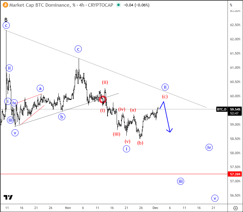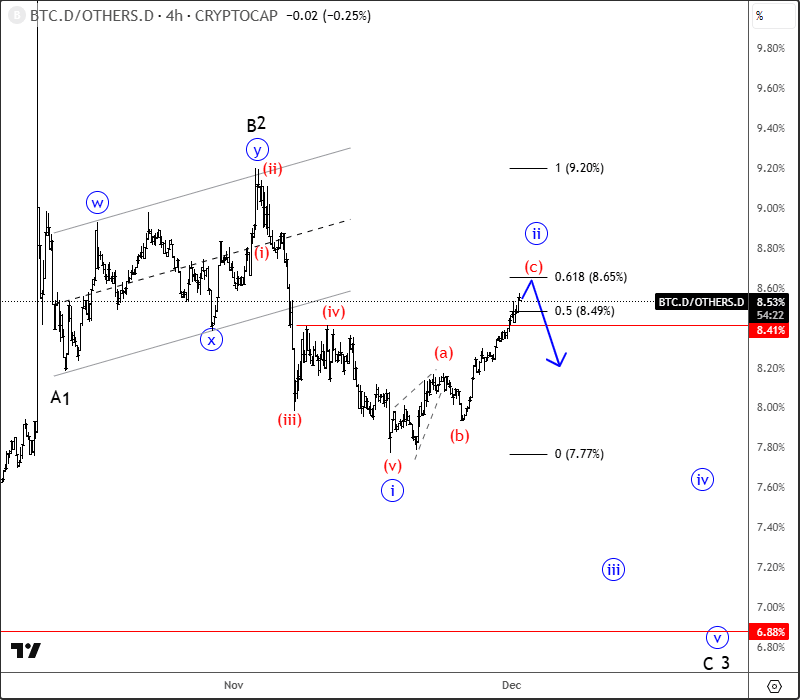 造成这种压力的主要原因是比特币,其价格可能持续疲软,因为比特币的市值占比图表目前处于潜在阻力区,在当前的三浪(a)-(b)-(c)修正性反弹之后,该阻力区可能将其进一步下探。这表明,相对于其他加密货币(山寨币),比特币的价格可能仍将保持疲软。