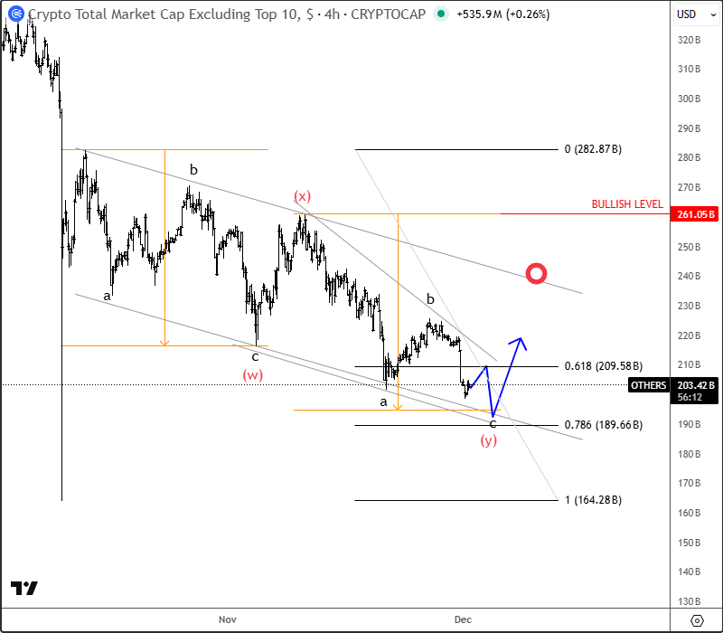 另一方面,其他加密货币(山寨币)市值图表(不包括前10名)加密货币可能正在完成复杂的 (w)-(x)-(y) 调整浪的最后一个子浪“c”,并可能在 2000 亿至 1800 亿美元区域内筑底。然而,只有当价格反弹并突破 2400 亿美元附近的通道阻力位时,多头才能重新掌控局面。