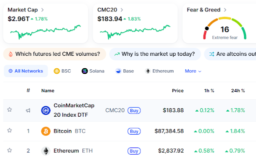截至本文撰写之时, 比特币上涨 1.84%,至 87,384 美元;以太坊上涨 0.79% 至 2,837 美元。在前 100 种加密货币中,63 种价格上涨,前 10 名中有 3 种价格上涨。分析师指出,我们可能尚未触底,因为交易员亏损平仓导致当前动能疲软,这表明在加密货币新闻周期中,整体动能仍然较弱。