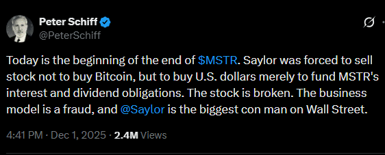 批评人士认为,这种情况可能会拖垮比特币乃至整个加密货币市场。事实上,彼得·希夫也持相同观点。称为这是“MSTR的终结”。