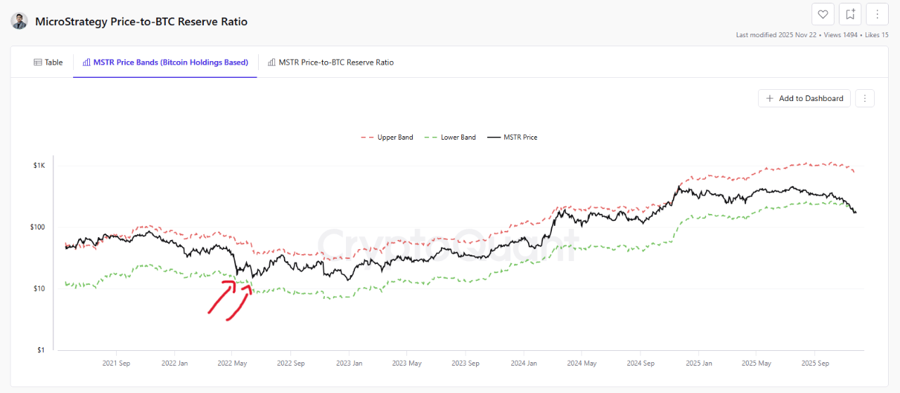 他突出显示相对于其比特币储备而言,当前的 MSTR 水平被低估了(标记较低的 MSTR 价格区间),这一信号引发了 2022 年的反弹。