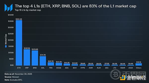 首先,了解一下L1代币目前的估值情况很有帮助。排名前四的L1代币,分别是以太坊(3611.5亿美元)、XRP(1301.1亿美元)、BNB(1206.4亿美元)和Solana(746.8亿美元),其总市值为6865.8亿美元,占整个L1山寨币市场的83%。在前四名之后,估值迅速下降(TRX市值为266.7亿美元),但有趣的是,长尾部分的规模仍然可观。排名前15之外的L1代币总市值为180.6亿美元,占整个L1山寨币市场总市值的2%。