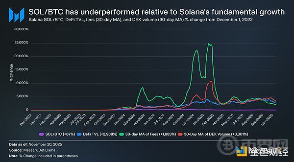 深入分析SOL的优异表现,实际上它可能表现不佳。在SOL跑赢比特币87%的同一时期,Solana的基本面呈指数级增长。去中心化金融(DeFi)总锁定价值(TVL)增长了2988%,手续费增长了1983%,去中心化交易所(DEX)交易量增长了3301%。无论从哪个角度来看,自2022年底以来,Solana的生态系统都增长了20到30倍。然而,作为旨在捕捉这一增长的资产,SOL的表现却仅比比特币高出87%。