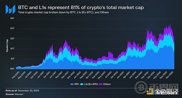 综上所述,我们认为,尽管L1的估值仍然基于对未来货币溢价的预期,但市场对这些预期的信心正在悄然减弱。与此同时,市场并未对比特币的货币溢价失去信心,而且比特币相对于L1代币的领先优势还在扩大。