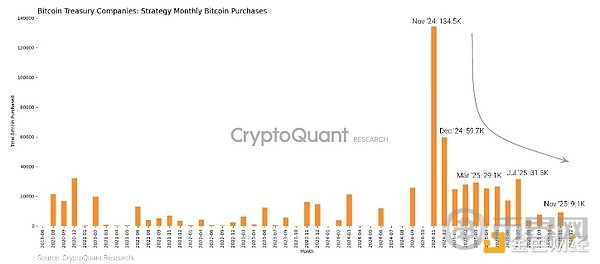 Strategy 的月度比特币购买量显示,自 2024 年 11 月的峰值以来,呈急剧下降趋势。来源:CryptoQuant