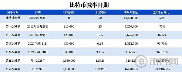 最近一次减半发生于 2024 年 4 月 20 日,当前区块奖励已降至 3.125 BTC。