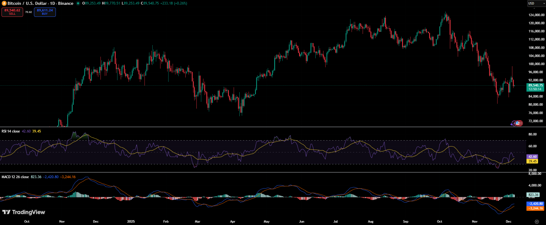日线RSI指标接近42,略低于中性区域,这表明动能正在降温而非耗尽。同时,RSI移动平均线接近39,表明动能并未强劲复苏,卖方仍保持微弱优势。