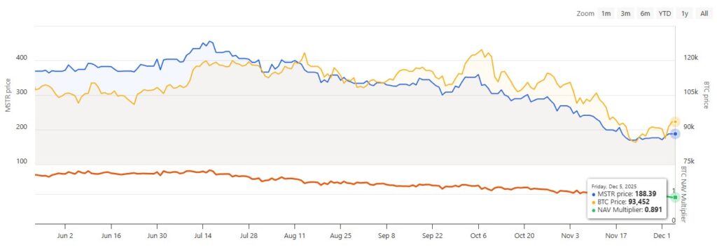 据比特币国库(Bitcoin Treasuries)的数据显示,全球最大的企业比特币持有者Strategy(MSTR)的市净率在11月11日跌破1.0,截至12月5日仍低于1.0,为0.886。数据.