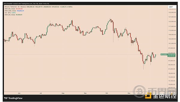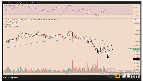 对熊市旗形形态的进一步分析显示,若价格在88,000 美元支撑位附近跌破,结合此前下跌波段的幅度测算,比特币 12 月的技术面下跌目标位约在77,100 美元。