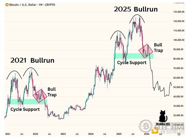 回顾 2021 年的行情,正是在这一牛市陷阱形成后,比特币开启漫长下跌周期,价格腰斩。而 2025 年的价格分形呈现出近乎相同的走势 —— 价格在同一支撑区间徘徊,随后大概率迎来破位下跌。
