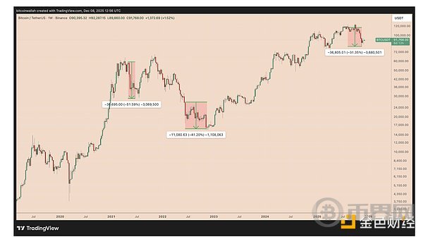 分析师 Alex Wacy 也给出了相同的下跌目标位,其依据是比特币已跌破多年上行趋势线压力位,历史数据显示,此类破位通常会引发 70% 的回撤幅度。