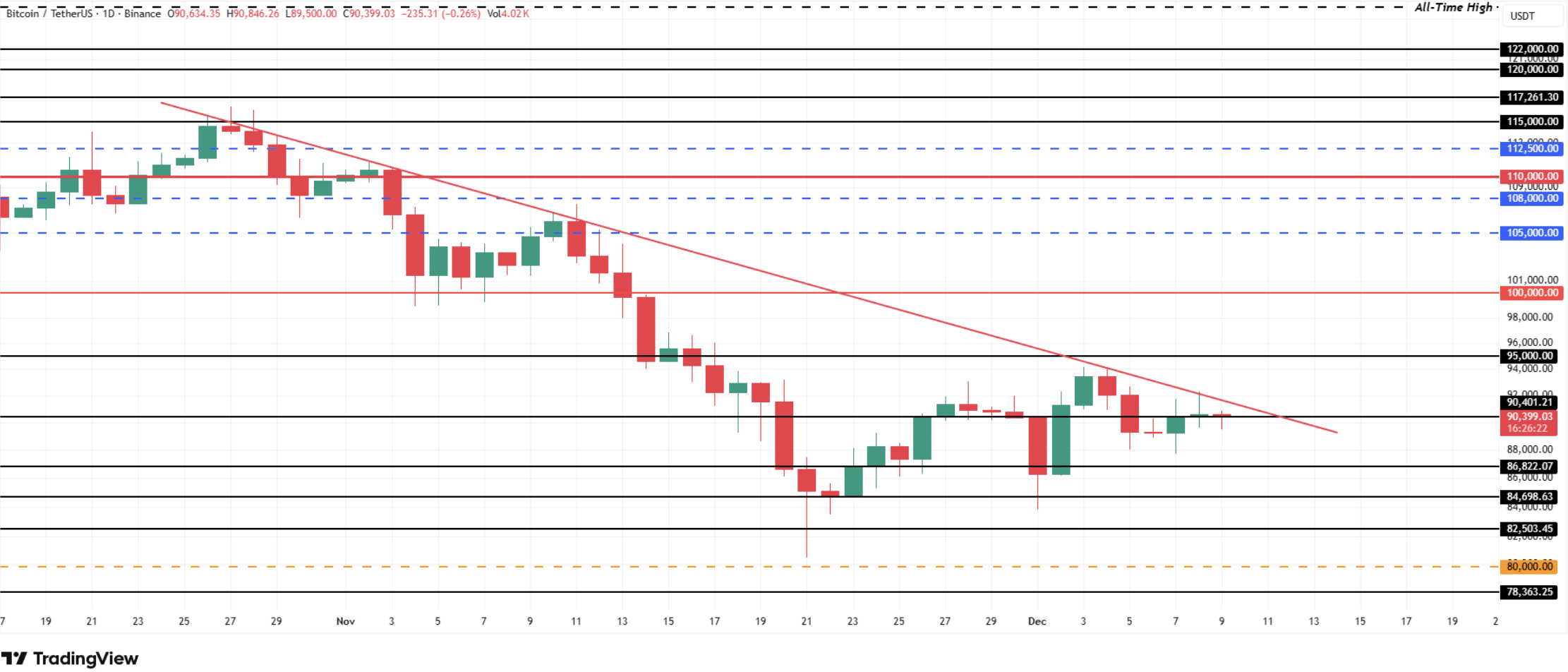 比特币价格在过去24小时内下跌了1.5%,但已从90,100美元强劲反弹,目前交易价格为90,350美元。然而,这种领先的数字资产在过去一周上涨了3.5%,正努力在2025年结束前重回10万美元大关。