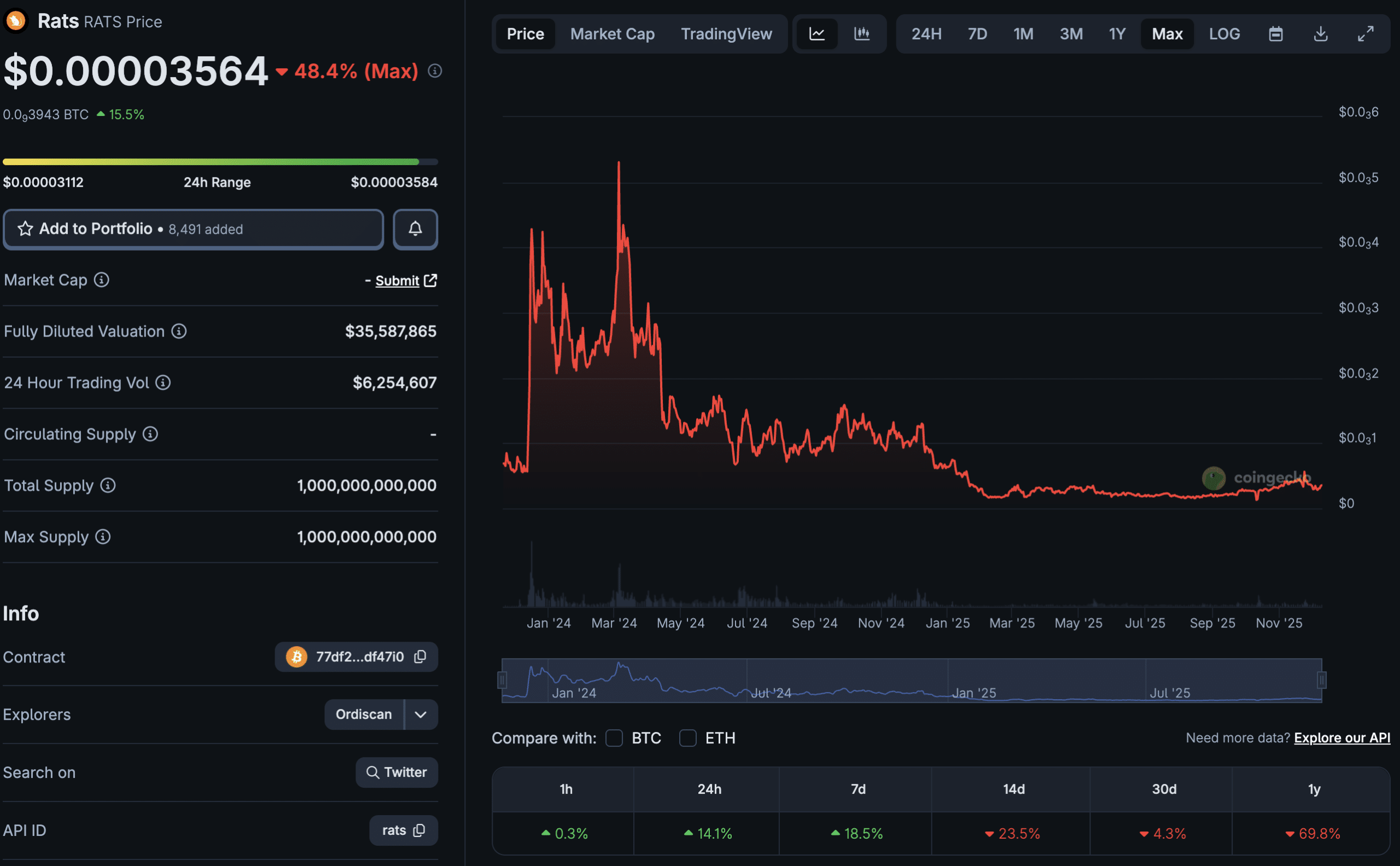 市值 24小时 7天 30天 1年 所有时间RATS 的情况也类似,较其历史最高点 0.00062 美元下跌了 96%,该最高点也是在 2024 年 3 月创下的。与 ORDI 相比,RATS 作为 Ordinal 项目知名度较低,因此不太可能再次达到如此高位,至少目前不太可能。
