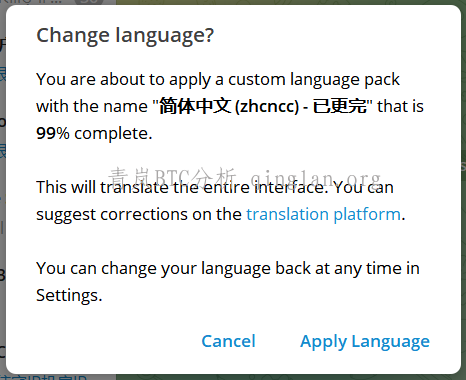 4-4、在Telegram 软件内会出现弹窗,这个界面显示了该中文语言包的翻译进度(X%),点击“Apply Language”,应用该语言包